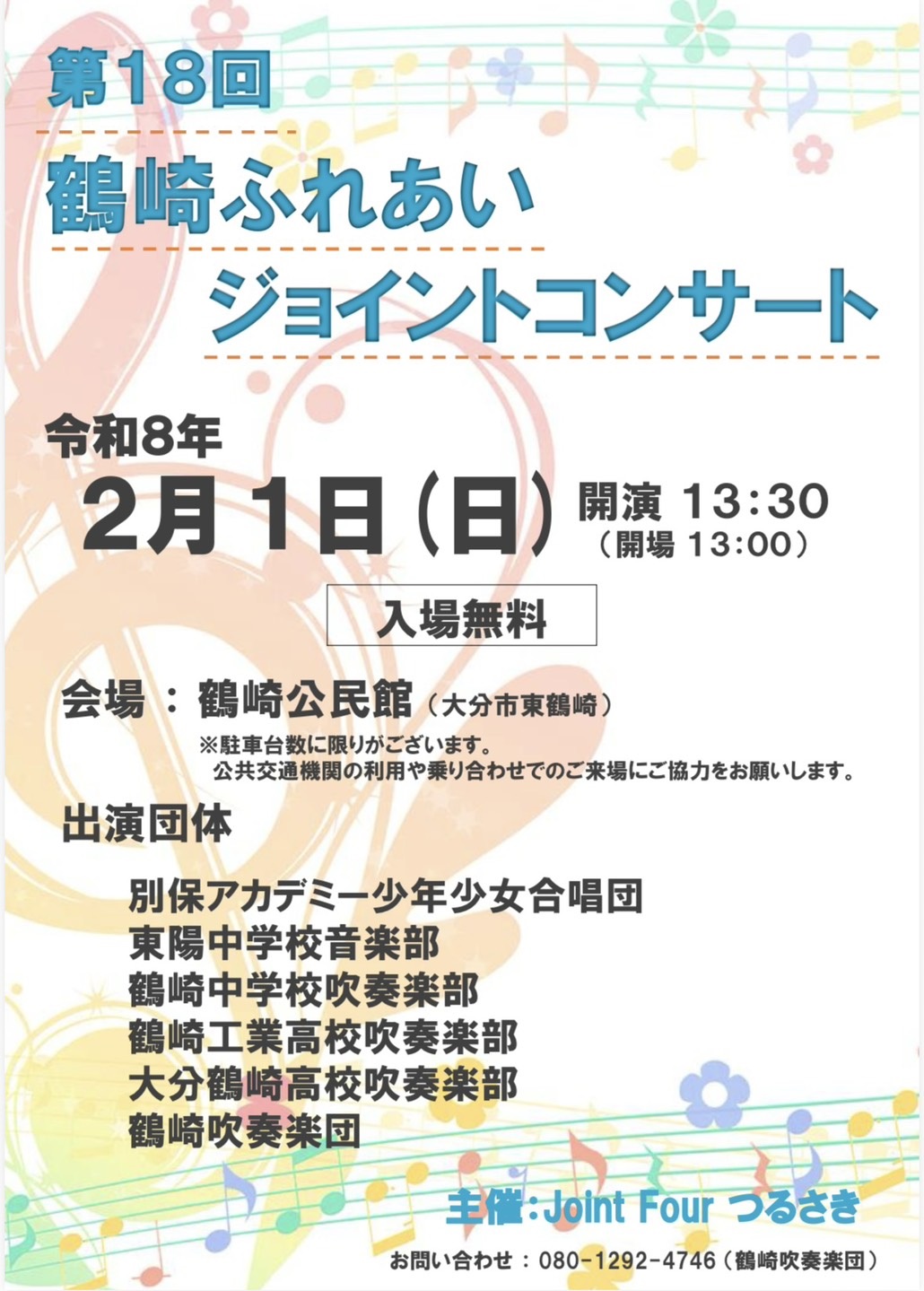 Joint Fourつるさき実行委員会 TEL:090-1292-4746(鶴崎吹奏楽団) |