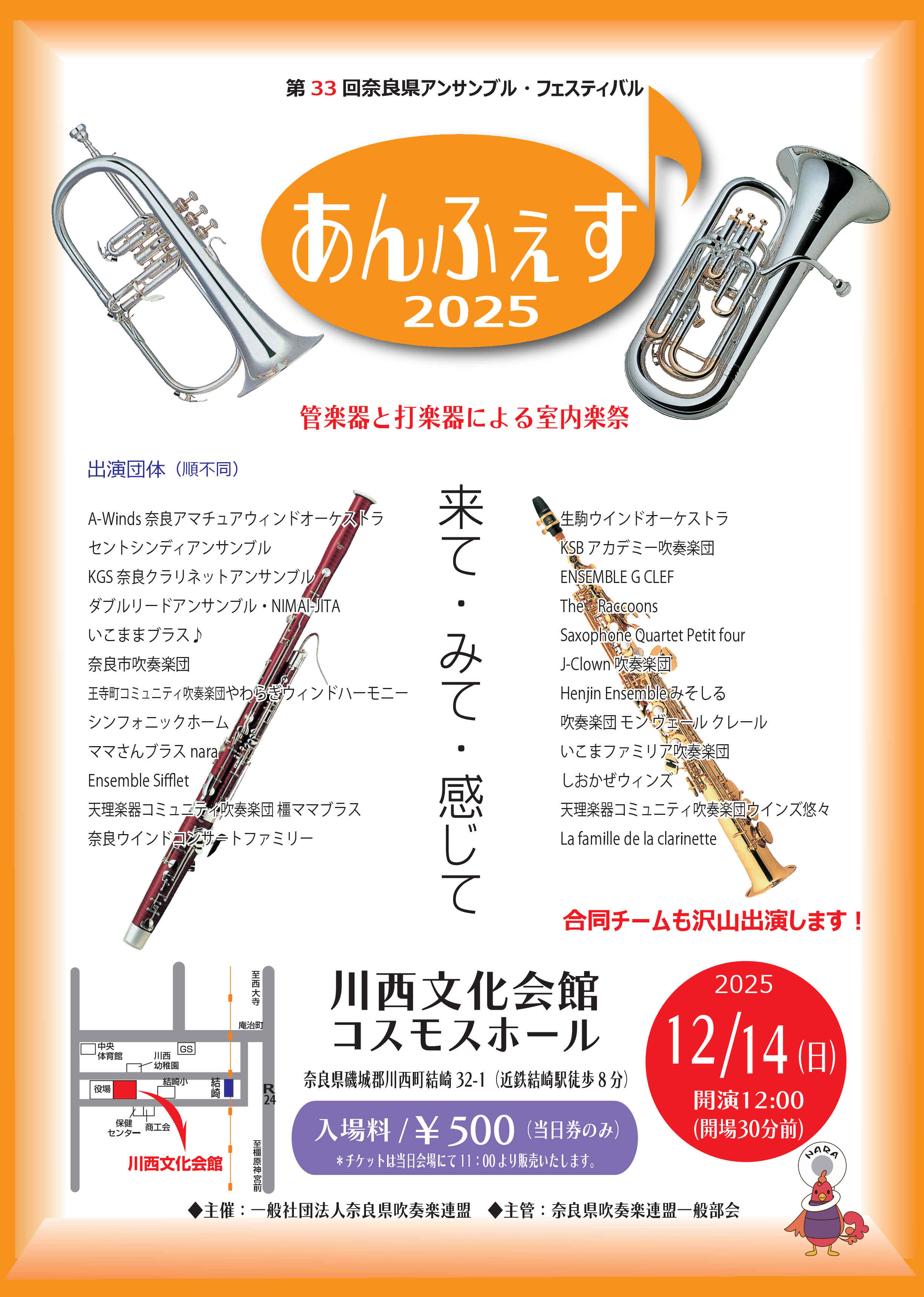 あんふぇす 2025 (第33回 奈良県アンサンブルフェスティバル) 2025.12.14.(日) 12:00開演(11:30開場) 川西文化会館 コスモスホール 近鉄橿原線結崎駅下車徒歩8分